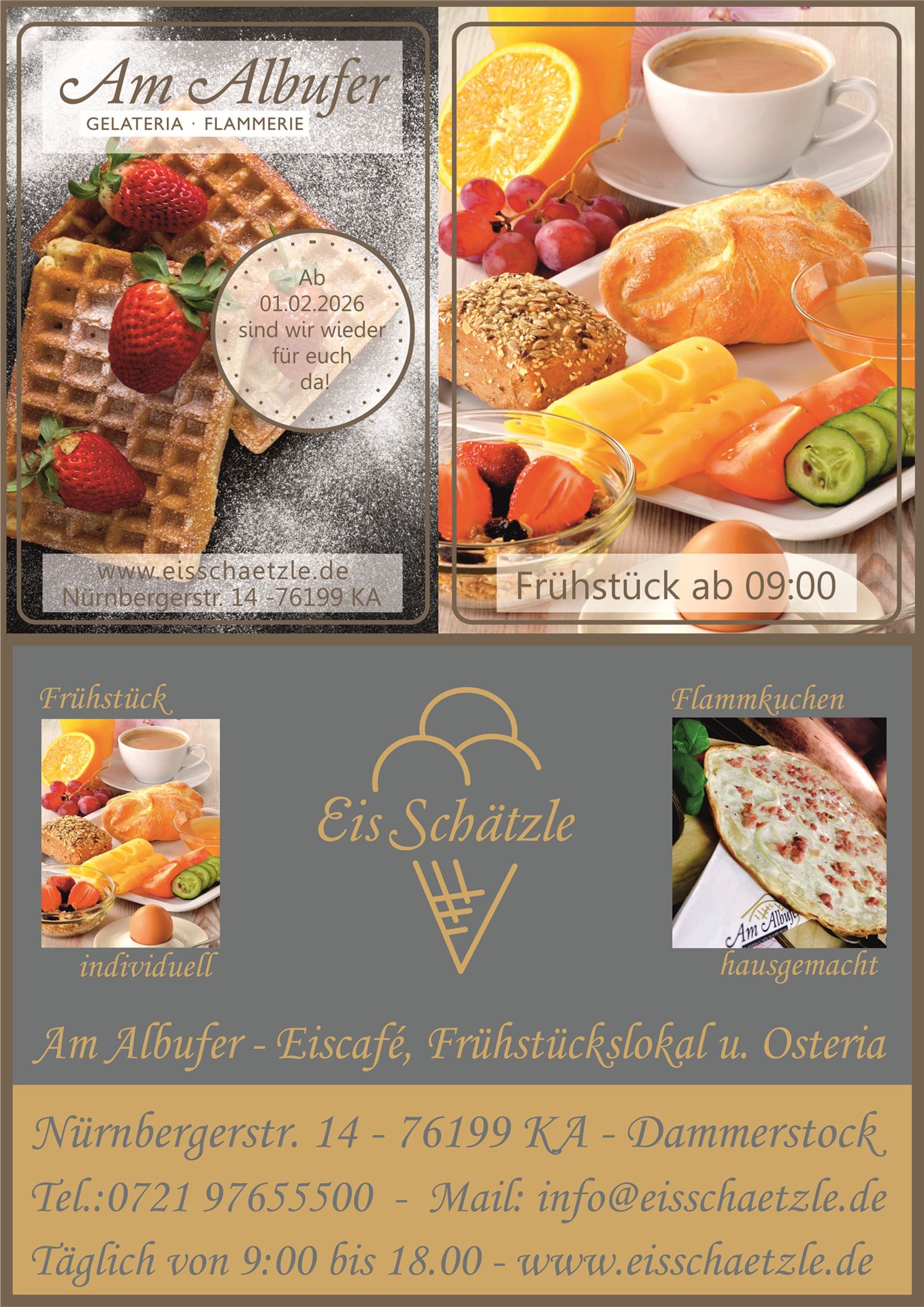 Öffnungszeiten: Täglich von 09:00 bis 18:00+ info@eisschaetzle.de Tel. 0721 97655500 |